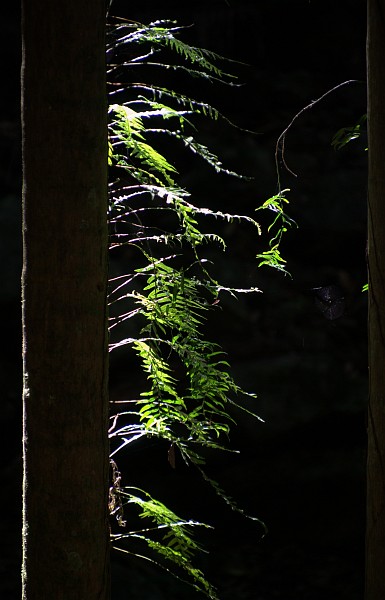 Farne, die an einem Baumstamm wachsen.
