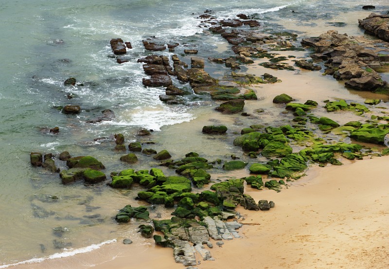 Bemooste Steine am Strand von New Castle.
