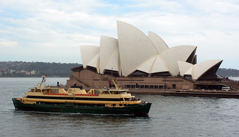 Das Opera House mit einer der typischen, symmetrisch gebauten Hafenfähren. Viele Fähren haben vorne und hinten eine Brücke, sodaß man sich das Wenden sparen kann.