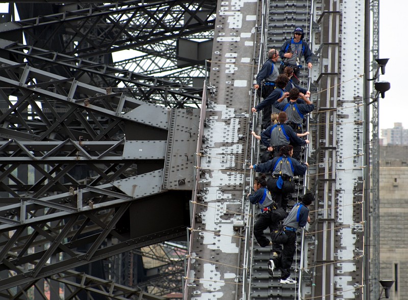 Gut gesichert wird die Brückenbesteigung absolviert. Sie dauert 3 bis 4 Stunden. Sehr schön zu erkennen sind die vielen Nieten, die die Brücke zusammenhalten.