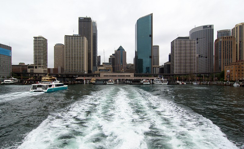Mit der Hafenfähre unterwegs. Im Hintergrund die Fähranleger und der Bahnhof Circular Quay der City Rail (doppelstöckige U- bzw. S-Bahn).