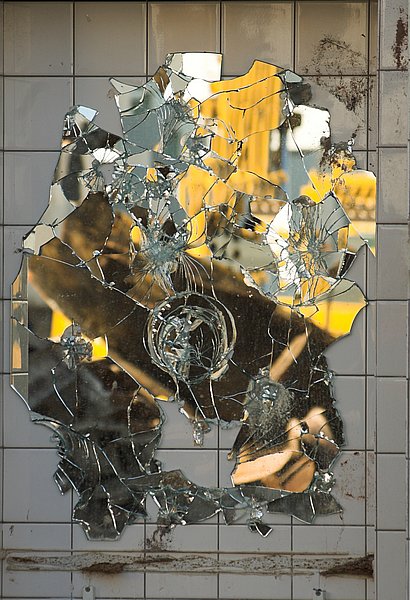 Überall an den Wänden hängen noch zerschlagene Spiegel. (März 2007)