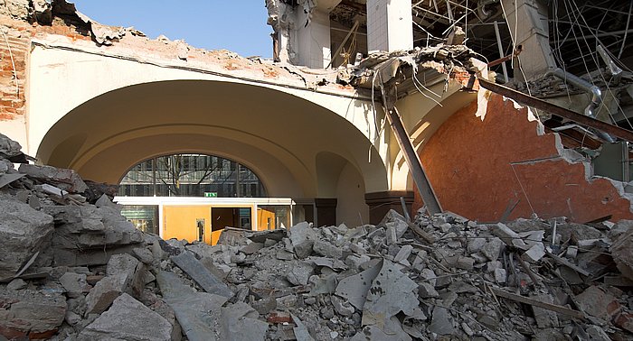 Hinter der Eingangstür. Linkerhand nicht im Bild die große Schwimmhalle, rechts war der wiederaufgebaute Teil. (März 2007)