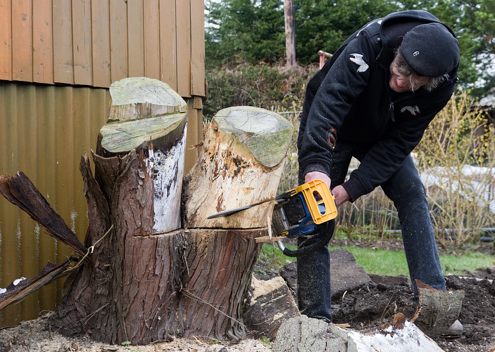 Auch der Stumpf der gefällten Eibe wurde nochmal beschnitten. Es war geplant, eine kleine Bank dort zu bauen. Die Kapuzinerkresse machte den Plänen jedoch einen Strich durch die Rechnung.