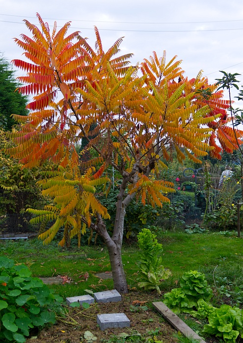 Auch 2 Essigbäume wachsen im Garten. Dieser hier, im ersten Jahr nach seinem Rückschnitt sehr hübsch anzusehen, musste dann Ende 2013 der Beeterweiterung weichen. Beim Rausreißen muss man unbedingt darauf achten alle Wurzeln zu entfernen, da sich von dort aus sonst neue Essigbäume bilden.