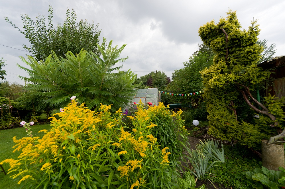 Kurz vorm Sommergewitter. Im Vordergrund blüht Kanadische Goldrute (Solidago canadensis).