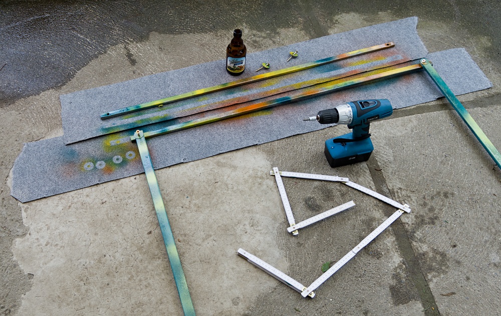 Die Stirnseite am Anbau sah schon immer etwas kahl aus. Stefan und ich entschlossen uns daher, aus übriggebliebenen Teilen des Gewächshausbausatzes eine Rankhilfe zu installieren. Zuerst musste die Farbgebung festgelegt werden. Wir entschieden, dass die Rankhilfe ähnlich wie das Gewächshaus aussehen soll.