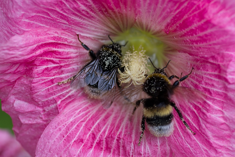 2 Gartenhummeln in einer Stockrosenblüte.