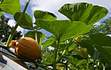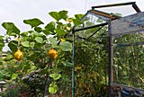 Da die Paprikapflänzchen im Gewächshaus zusehends zum Raub der Schnecken wurden entschlossen wir uns, stattdessen einen Hokkaido dort anzupflanzen. Mal sehen, ob er die knapp 3 Meter bis zur Dachluke schafft, überlegte ich. Er überwand sie in ca. 3 Wochen und legte dann erst richtig los.