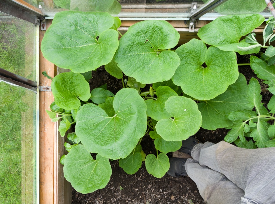 Gut eine Woche nach dem Auspflanzen ins Gewächshaus hat er sich schon prächtig entwickelt (21.7.2015).