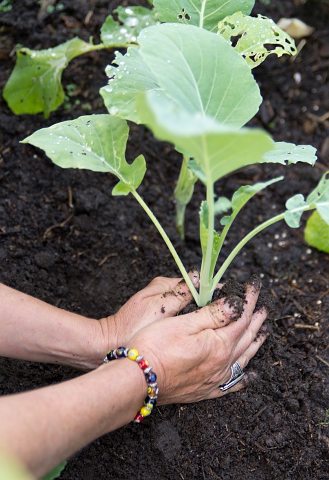 Größere, im Blumenkasten vorgezogene Kohlrabis (sog. Ersatzkohlrabi) werden gepflanzt.