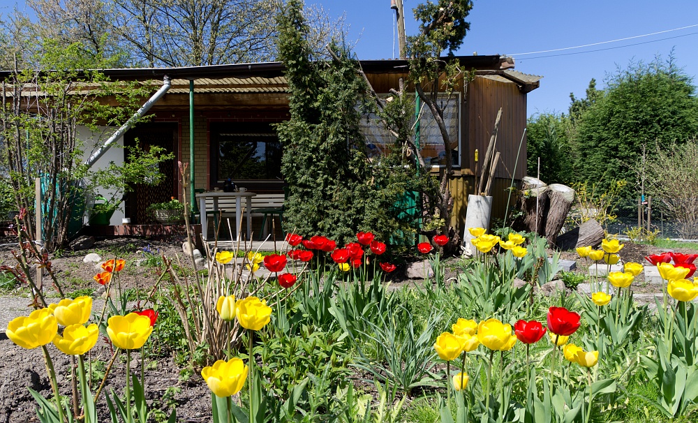 2013. Die Eibe ist schon lange gefällt, die Tulpen blühen. Links wird das Gewächshaus geplant.