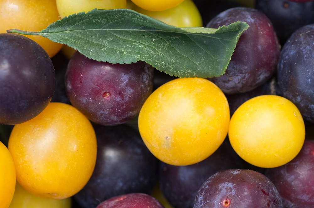Blaue und gelbe Mirabellen. Die blauen (evtl. Haferpflaumen) kommen richtigen Pflaumen geschmacklich recht nah, die gelben schmecken eher wie Mirabellen. Die Früchte sind knapp 3cm groß.