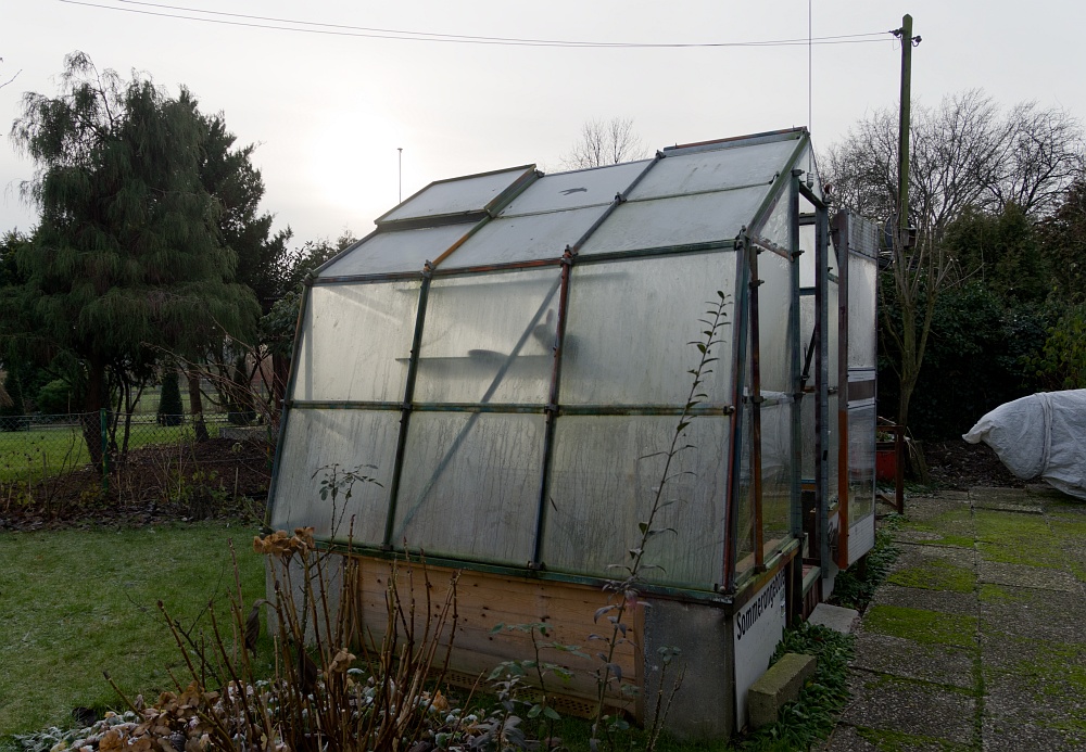 Dezember 2014. Das Gewächshaus ist in Frost erstarrt.