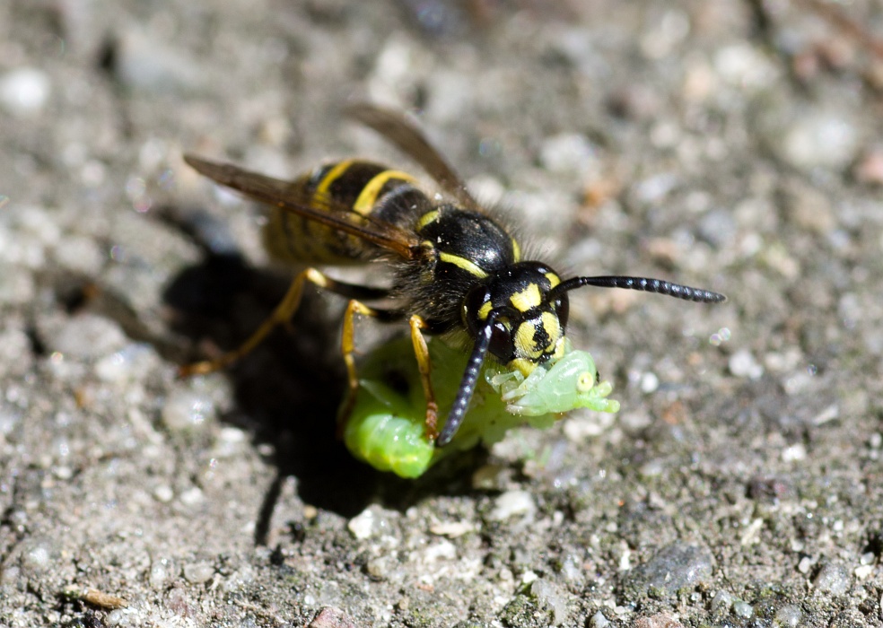 Gemeine Wespe beim Zerlegen eines Grashüpfers.