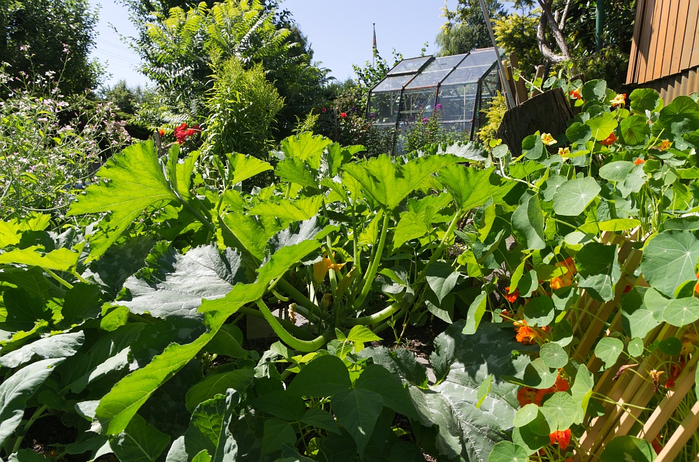 2013 bauten wir grüne Zucchini an. Die kann man tatsächlich in dem Blätterwald übersehen, aber dann werden sie bis zu 50cm lang :-)