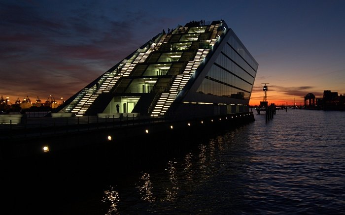 Beleuchtetes Dockland an einem Winterabend.