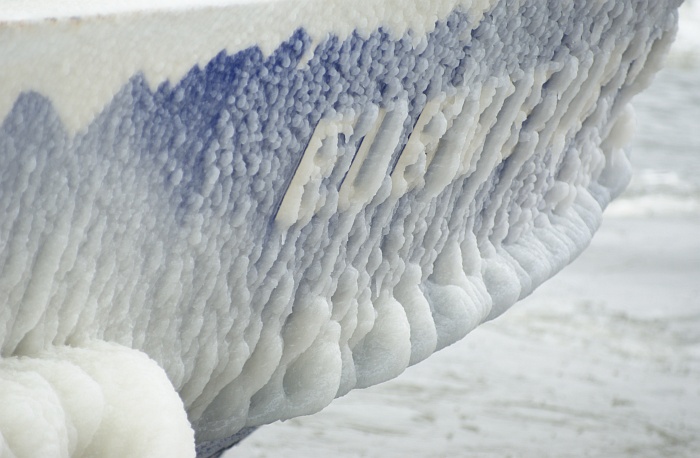 Der vereiste Bug der Hafenfähre Elbmeile (Januar 2010).