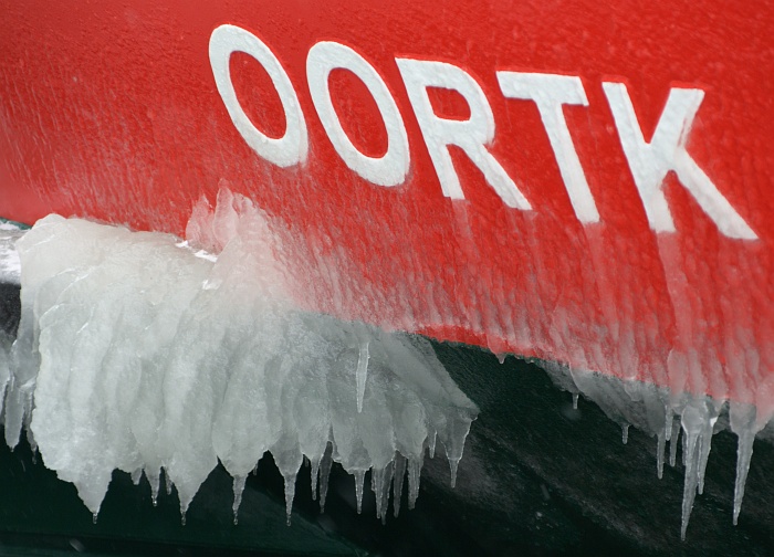Große Eisplacken am Bug der Hafenfähre Oortkaten (Januar 2010).