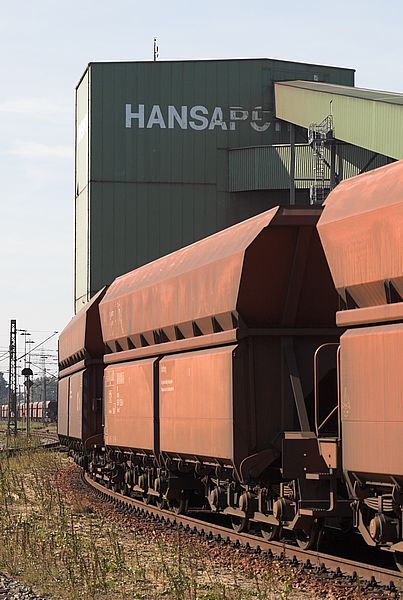 Züge und Gebäude sind mit rostrotem Staub bedeckt.