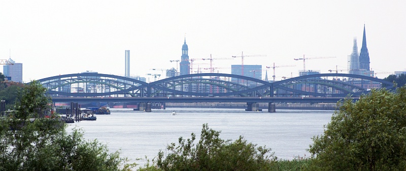 Blick von der Elbinsel Kaltehofe zu den Elbbrücken. Im Hintergrund sind viele Kräne der Großbaustelle Hafencity zu sehen.