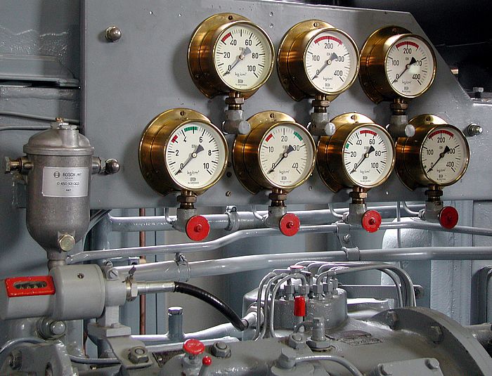 Jede Menge blankgeputzte Manometer.