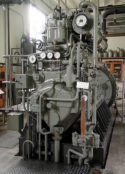 Der Dieselmotor von vorne gesehen. Hinten ist das Schwungrad des Generators zu erkennen.