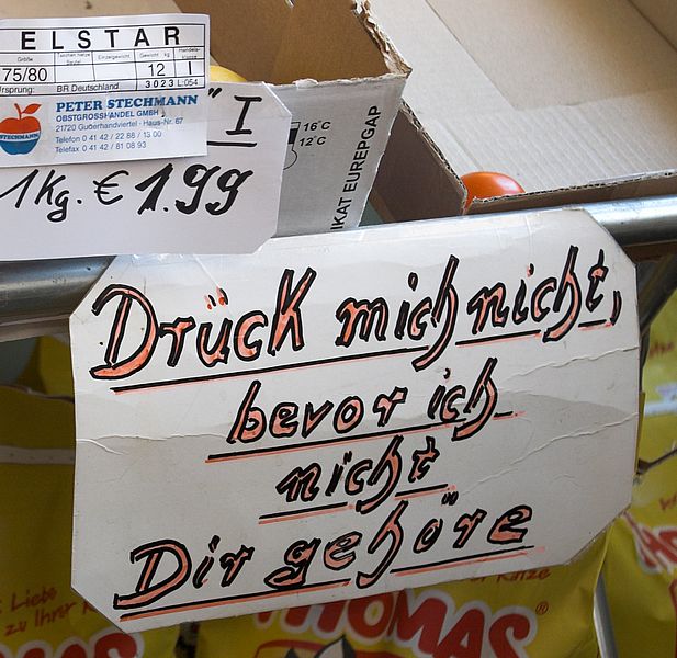 Die letzte Tomate und der letzte Apfel warten auf einen Käufer.