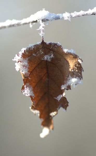 Pulverschnee und Rauhreif auf einem trockenen Blatt.